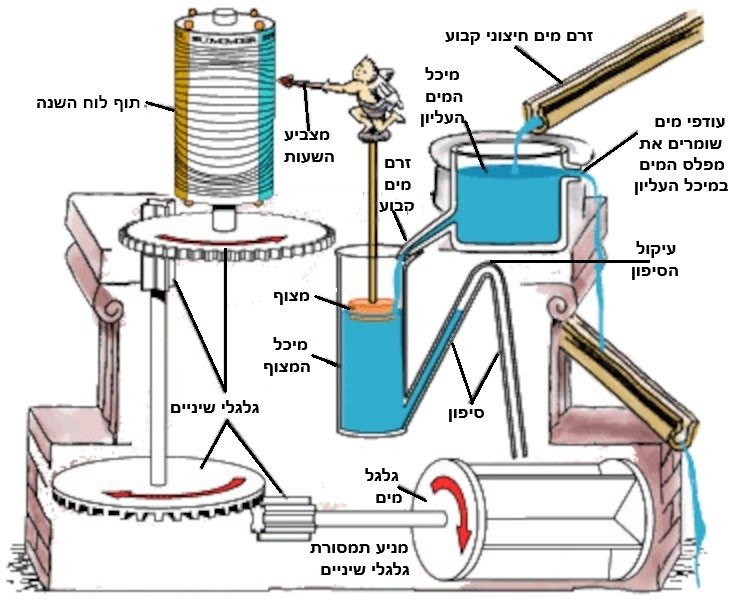 בתמונה תרשים משוער של הקלפסידרה לפי כתבים מהתקופה. המיכל עם המצוף מתרוקן מדי יום לגלגל המים המניע את תמסורת גלגלי השינים. גלגל השיניים העליון, מסובב את התוף סיבוב אחד במשך השנה.