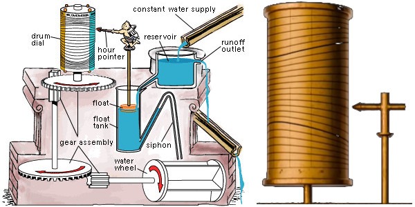 התרוקנות המיכל הייתה המעבר ליום חדש, כלומר השעה הראשונה של היום. - הסיפון היה מרוקן את המים לגלגל מים. שהניע מערכת גלגלי שיניים, אשר סובבה את התוף סיבוב אחד במשך שנה.